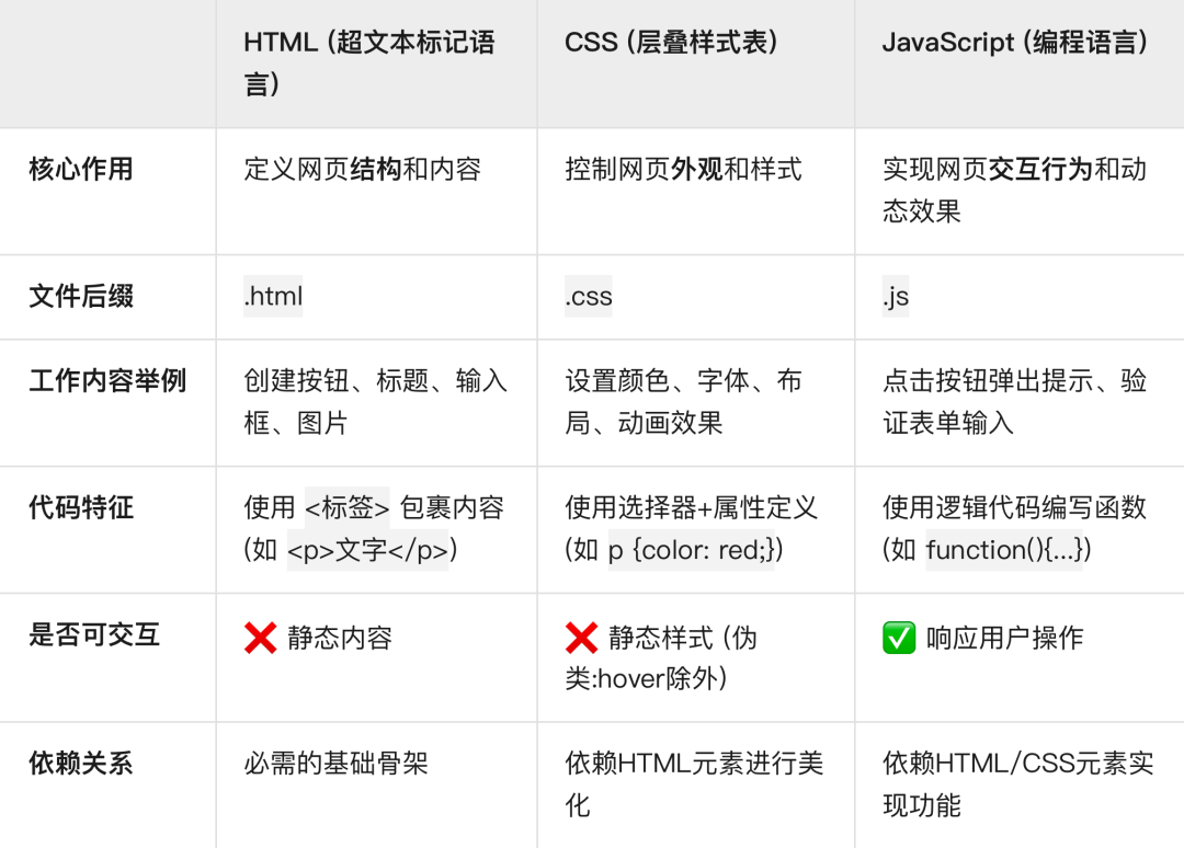 我们上篇解释了JavaScript是什么。本篇将讲解它与HTML、CSS的区别以及三者如何协作。 学习到这里,我相信你已经多少意识到这三种技术存在关联性,但需要更系统的解释。 这是个极其重要的基础问题,HTML、CSS、JavaScript 就像建造一栋房子的三大核心工种,它们各司其职又紧密配合: 三者关系: 详细区别对照表 三者如何联动?(简易代码演示)