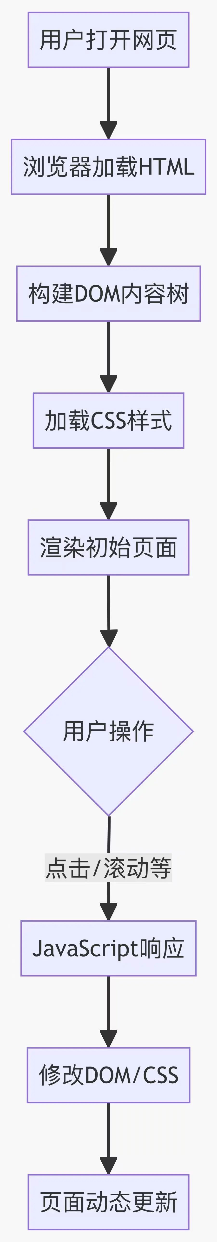 联动效果说明: 1. HTML 创建了一个带id的<div>方块 2. CSS 定义了方块的初始样式(.box)和点击后的样式(.active) 3. JavaScript 实现: ◦ 监听方块点击事件 ◦ 动态切换CSS类名(添加/删除.active) → 结果:点击方块时,它会从蓝色变为红色并旋转45度 现代网页运作流程: 💡 关键认知: 1. HTML是地基:没有它,CSS/JS无处依附 2. CSS是皮肤:改变它只影响视觉效果,不改变核心功能 3. JS是神经: ◦ 可操作HTML元素(增删改查DOM) ◦ 可动态修改CSS样式(如点击变色) ◦ 可处理数据/网络请求等复杂逻辑 ✅ 简单公式:网页 = HTML(内容) + CSS(美化) + JS(交互) 打开浏览器开发者工具(F12),在Elements/CSS/Console标签间切换,你能直观看到三者如何协同工作 结语: 本期深入地探讨了JavaScript与HTML、CSS之间的区别,以及三者之间如何联动;并且给出了简易代码和效果预览。 相信经过此篇的学习,你对这三者之间的理解会有更加系统性的认识。 下篇我们会对DOM进行讲解,它是什么?如何发挥作用? 阅读原文:原文链接 该文章在 2025/8/1 16:36:22 编辑过 |