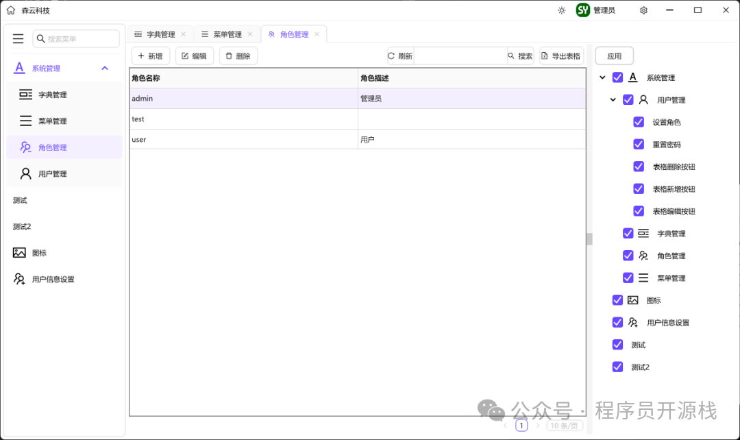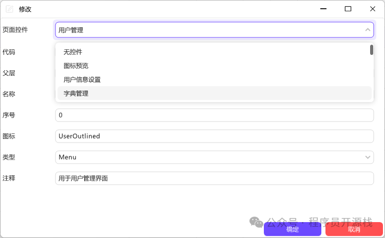 菜单管理:实现菜单的增删改查,支持自定义页面控件和样式。