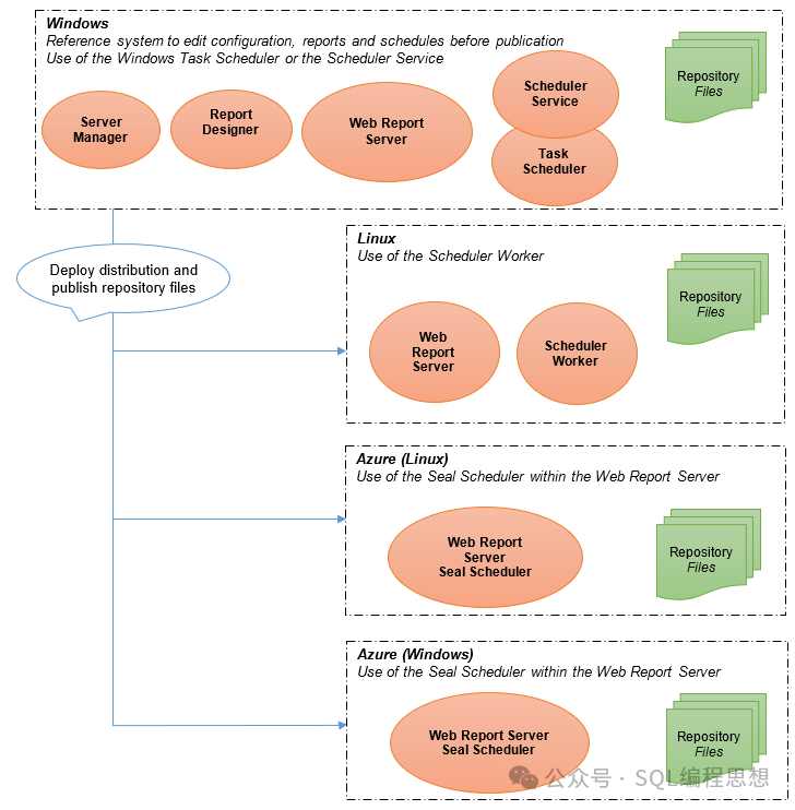 - • 任务调度器(Task Scheduler)按照配置计划自动触发报表的执行、生成输出文件以及执行分发操作。