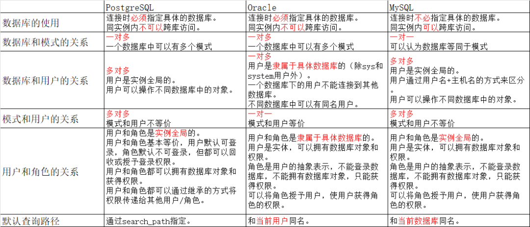 与Oracle/MySQL的对比 在Oracle和MySQL中,逻辑结构与PG有一些差异。例如在Oracle中用户与模式严格绑定,淡化了模式的概念;在MySQL中采用了扁平化的层级设计,数据库即是命名空间(模式)。 关于PostgreSQL、Oracle和MySQL三种数据库中逻辑架构,可以用下图概括: 以下是三类数据库中关于逻辑架构的差异点总结: ![]() 该文章在 2025/8/4 9:06:54 编辑过 |