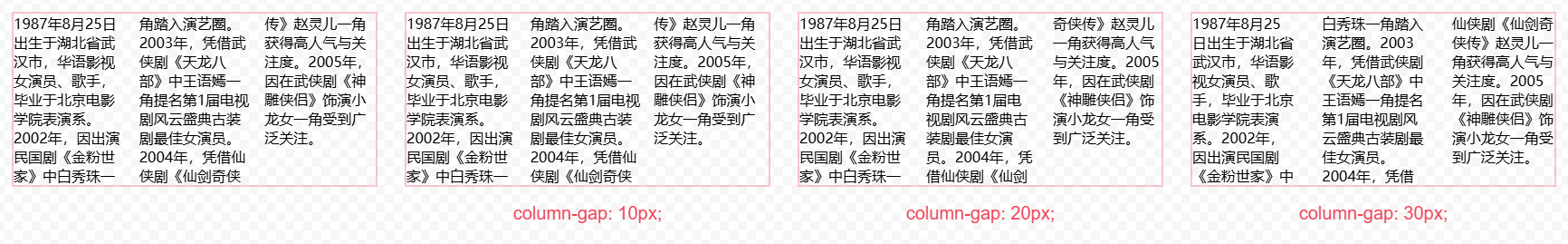 column-gap 设置列间隔。默认值 normal 表示列间距占用 1em 宽度。