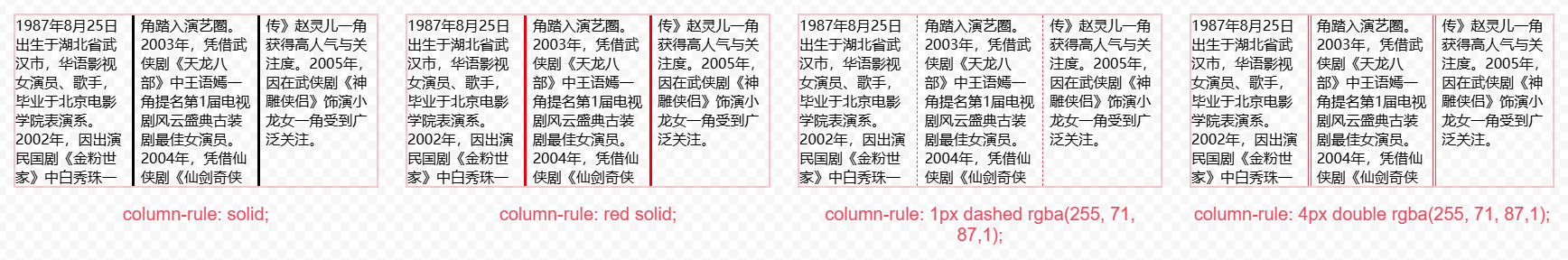 column-rule-style 与 border-style 一样,支持值:none 、 hidden 、 dotted 、 dashed 、 solid 、 double 、 groove 、 ridge 、 inset 、 outset。