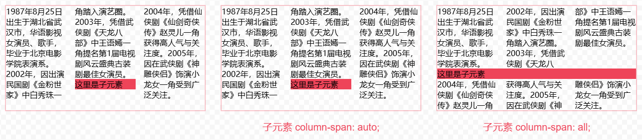 column-span 设置子元素是否跨列显示。有效值:none(不跨列)、all(跨列)。