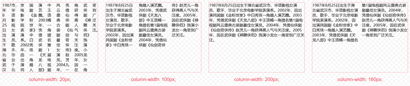 column-width 设置列的宽度。浏览器会自动调整宽度大小,如果设置的宽度连两列都放不下,会自动变为一列显示(如图三)。