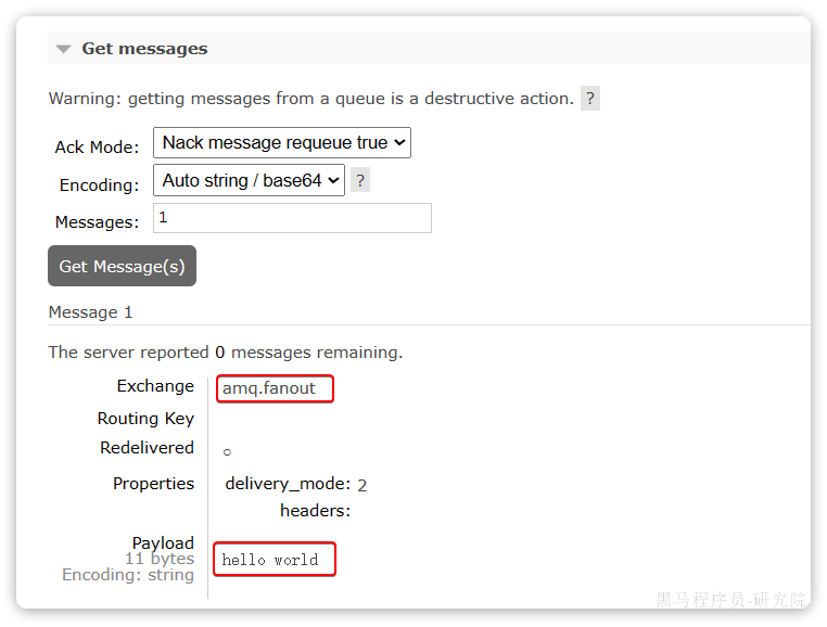 此时,我们到MQ控制台删除object.queue中的旧的消息。然后再次执行刚才的消息发送的代码,到MQ的控制台查看消息结构:
