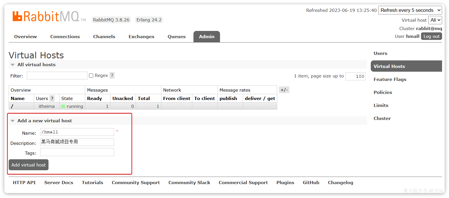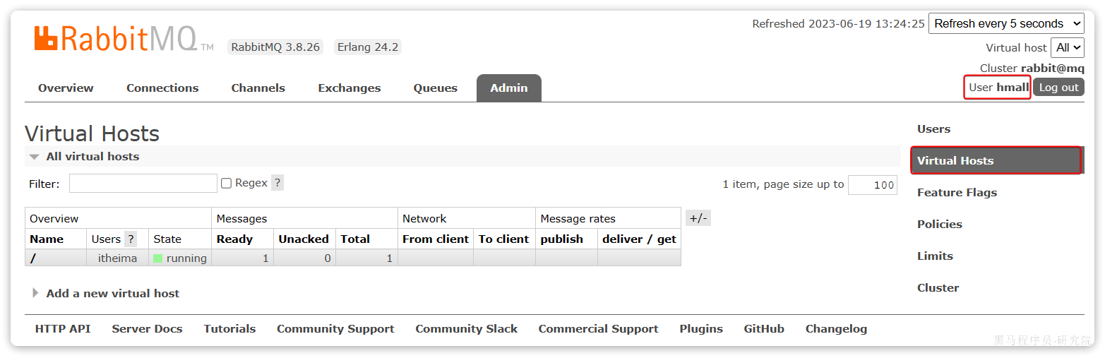 此时,点击页面右上角的virtual host下拉菜单,切换virtual host为 /hmall