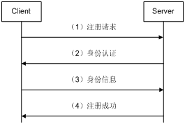 如图 3所示,连接初始化的过程为: (1) Client通过连接请求报文将自s己支持的完整性验证算法、加密算法等发送给Server。 (2) Server按照优先级从高到低的顺序从自己支持的算法列表中依次选择算法,与Client发送的算法列表进行匹配。如果匹配成功,则使用该算法,Server通过连接响应报文将算法协商结果发送给Client,同时,Server和Client生成加密密钥和完整性验证密钥。 (3) Client和Server分别利用初始化完成报文验证算法和密钥协商是否成功。 2. 注册阶段图 4 注册流程图