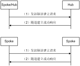 如图 4所示,注册阶段的具体过程为: (1) Client向Server发送注册请求报文,注册请求报文中包括DVPN节点的信息。 (2) Server收到注册请求报文后,根据配置决定是否对该Client进行身份认证。如果配置为不认证,则直接注册Client信息并向Client发送注册成功响应,身份认证步骤省略;如果配置为认证,Server向Client回应身份认证请求,并指明需要的认证方法(CHAP认证时还返回一个随机数)。 (3) Client向Server提交自己的身份信息。 (4) Server收到Client的身份认证信息后向AAA服务器发起认证,收到AAA认证成功的响应后再发送计费请求,当Server收到计费成功响应后,向Client发送注册成功响应报文,注册成功报文会携带下发给Client的Hub信息。 3. 隧道建立阶段当Spoke注册成功后,要和Hub建立永久隧道,一个Spoke最多和两个Hub建立永久隧道。如果在一个VPN域中有两个Hub,则Hub之间需要建立永久隧道。具体隧道建立流程如图 5所示: 图 5 隧道建立流程图