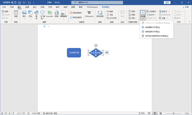 3、如果你想用Word在流程图形状里面填写文字,那么你需要从绘图工具中拖出一个文本框,或者选中当前形状后右键选择“添加文字”。