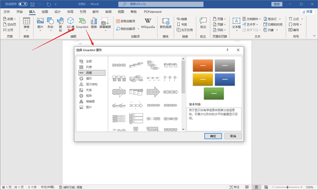 1、打开Microsoft Word,在“插入”菜单中,你可以看到 SmartArt。点击SmartArt,在它弹出的选项卡中点击“流程”部分,选择你想要的布局,根据自己的需求调整相应的图形参数。