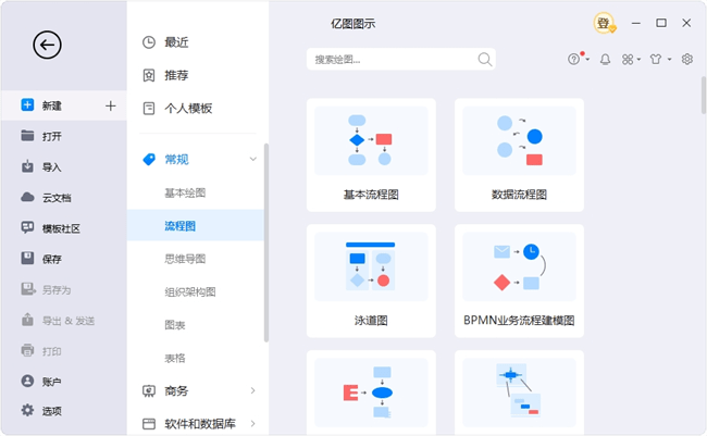 1、在“新建”页面中可以看到“流程图”分类。双击其中的小类如“基本流程图”,就可以创建相应的空白画布。
