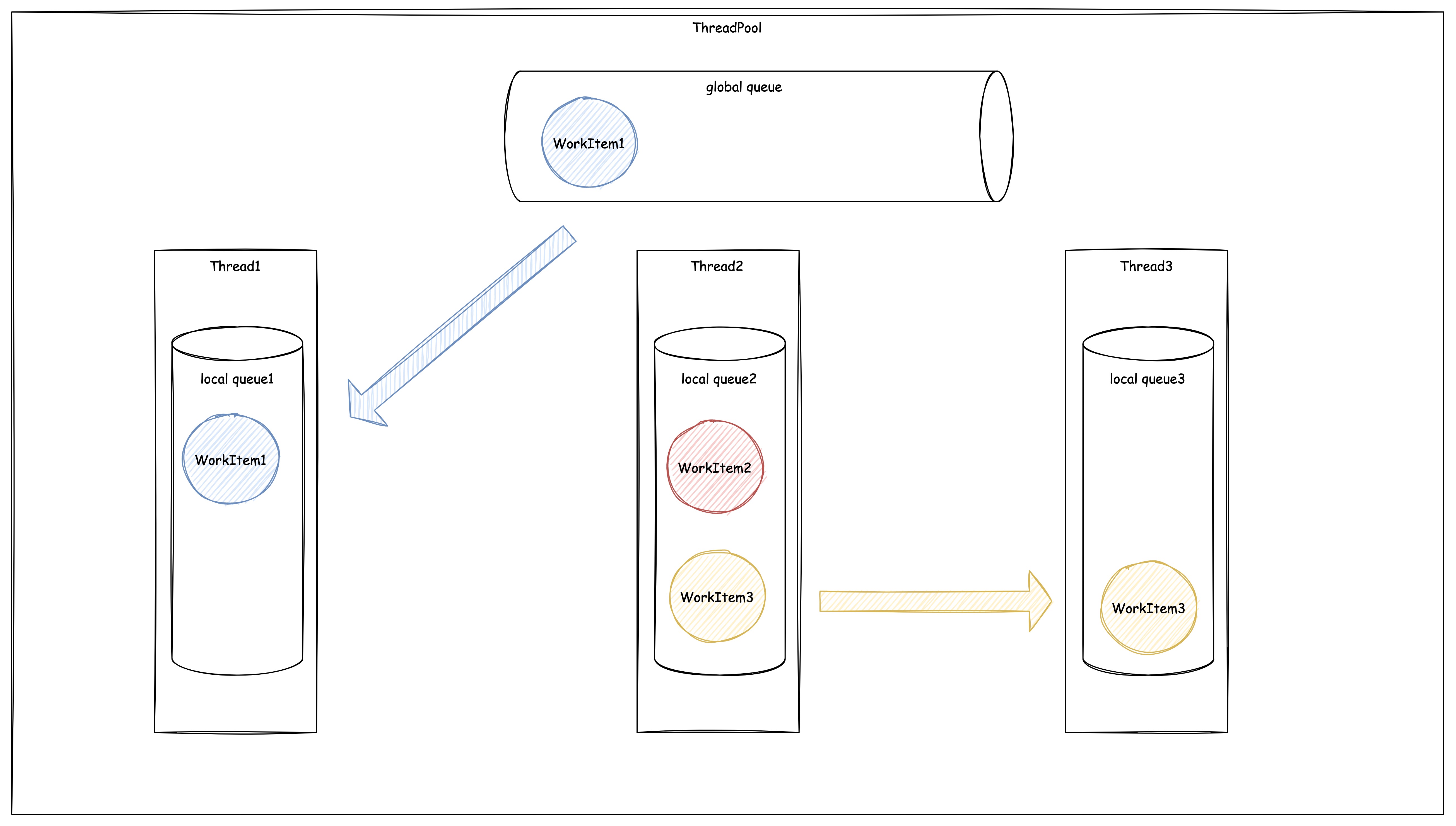 线程池的待执行任务被存放在一个队列系统中。这个系统包括一个 全局队列,以及绑定在每一个 Worker Thread 上 的 本地队列 。而线程池中的每一个线程都在执行 while(true)