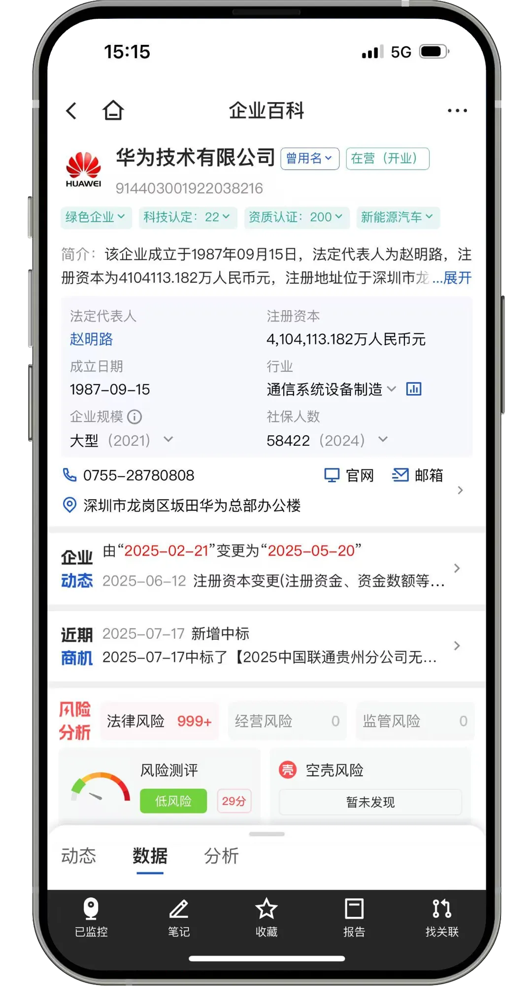 点击图片⬆️⬆️⬆️ 立即体验 1. 信息全到超乎想象,想查的都有。 企百科信息覆盖超全面,从注册资本、经营范围、法人及股东等基本工商信息到司法诉讼、行政处罚、失信记录等风险信息,可以对企业及其风险状况一目了然;如果想了解企业的经营布局、股权结构、对外投资、商标专利等知识产权信息可直接查询。 企百科灵动搜索,支持关键词精准检索,例如输入“华为”,可以搜索与其相关的企业、相关人员及所关联的法律风险、经营风险、商标专利等。 2. 特色“企业百科”,秒懂企业。 如果觉得一家企业的全量信息太多,找不到重点,可以点开“企业百科”,在这里,信息经过高度浓缩提炼,可以快速浏览企业工商基本信息、企业关联关系、高管团队、司法信息、知识产权等核心板块,像看"百科词条"一样清晰,新手也可以秒懂企业。 3. 股权不限层级,一穿到底。 分析企业关联关系时, “看一半要付费”最令人头疼,企百科的股权穿透图免费开放,不管是子公司、孙公司,还是间接持股关系,都能层层展开,一穿到底,谁是实际控制人一目了然。 4. 司法案件,穿透关联。 从立案到判决、执行,企业涉诉的每一步进展都能查;还可以能看到同类案件的判决结果,预判风险,这些在其他工具里要付费的功能,在企百科这里全免费。 5. 集团成员,敞开看。 在企百科,查集团成员,没有多层嵌套的收费套路,从目标企业所属集团,到集团有多少家成员,每家是谁都能直接免费看,集团关系网敞开看,一眼看清全貌。 该文章在 2025/8/14 15:25:48 编辑过 |