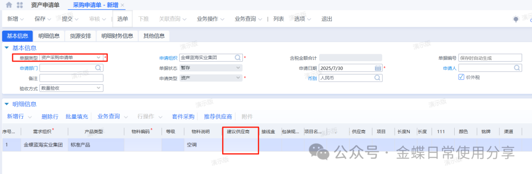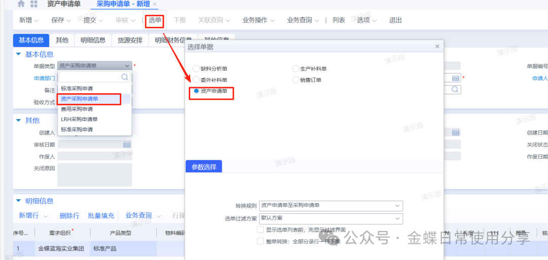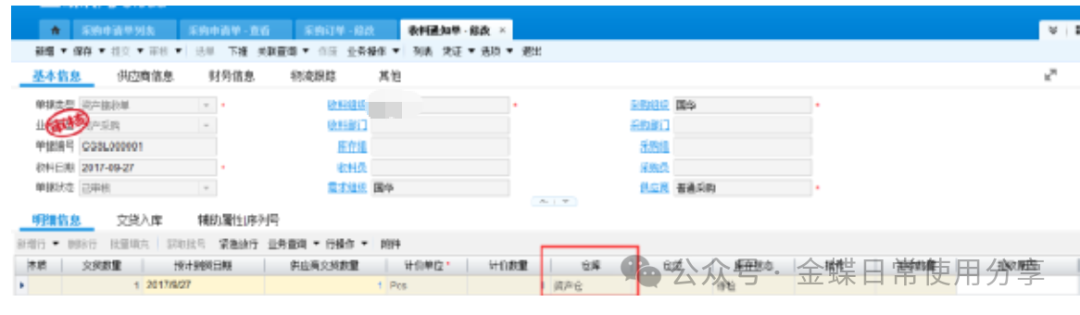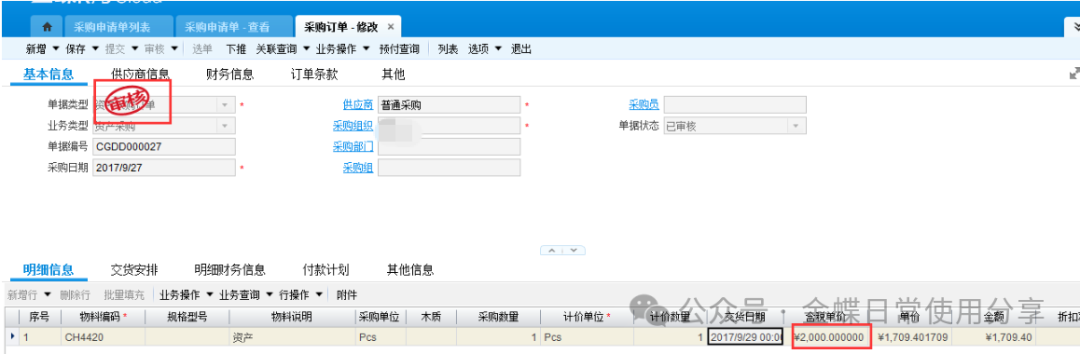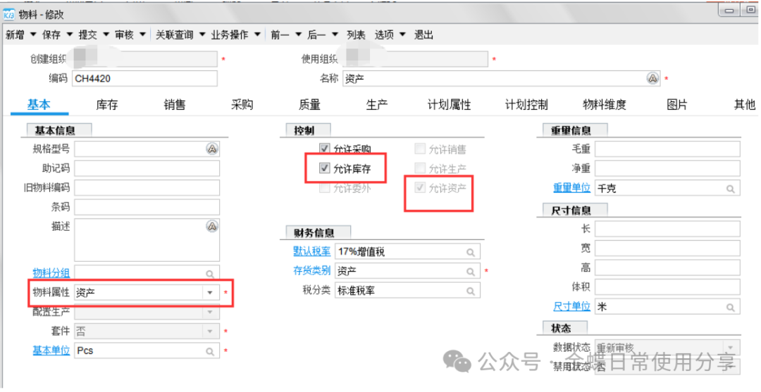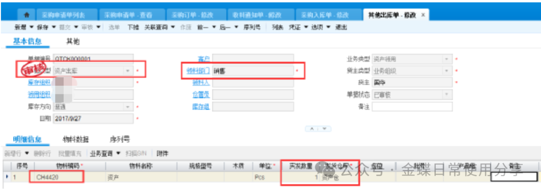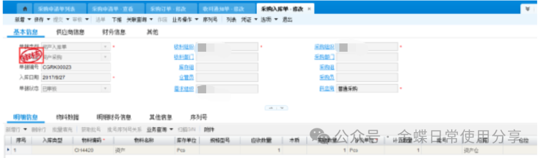 2业务数据2.1创建物料【业务场景】:企业用户资产物料的建立 【用户角色】:管理会计 【功能菜单】:【基础资料】->【主数据】->【物料】 【操作说明】:注:只有物料属性为资产的物料才能做资产申请单。 系统默认资产物料不入库,如果客户实际业务需要入库,那么在新建资产物料时一定要允许库存。 2.2 资产申请单(可选)【业务场景】:企业用户新增资产提交申请 【用户角色】:企业用户 【功能菜单】:【资产管理】->【固定资产】->【资产请购】->【资产申请单】 【操作说明】:资产需求采购部门在系统中创建资产申请单,填写需求组织及部门、所需资产物料(物料属性为资产),数量及到货日期并提交审核。 2.3采购申请单【业务场景】:企业用户新增资产提交采购申请单 【用户角色】:采购员 【功能菜单】:【采购管理】/【资产管理】->【采购申请-采购申请单】 【操作说明】:当需求人员做了资产申请单的情况下,首先调整采购申请单的单据类型为资产采购申请单,再通过选单的方式创建采购申请单,选择采购组织、录入推荐供应商(可选)提交审核。 若需求人员不做资产申请单,可以直接创建采购申请单来达到申请的需要,单据类型为资产采购申请单,手动填写资产申请组织及部门、采购组织、物料、数量、到货日期、及建议供应商(可选)并提交审核。 2.4 采购订单【业务场景】:企业用户新增采购订单 【用户角色】:采购员 【功能菜单】:【供应链】->【采购管理】->【采购申请】->【采购申请列表】->【下推采购订单】 【操作说明】:采购员填写单价并提交审核。 2.5采购收料【业务场景】:企业用户进行采购收料操作 【用户角色】:采购员 【功能菜单】:【供应链】->【采购管理】->【订单处理】->【采购订单列表-下推操作】 【操作说明】:采购订单下推收料通知单,若实际业务需要入库且该资产物料设置了允许库存,则填写仓库,否则直接提交审核,没有入库动作的直接看2.8。 2.6采购入库【业务场景】:企业用户进行采购入库操作 【用户角色】:采购员 【功能菜单】:【供应链】->【采购管理】->【收料处理-收料通知单列表】->【下推操作】 【操作说明】:提交审核 2.7资产出库【业务场景】:企业用户需要资产出库 【用户角色】:仓储员 【功能菜单】:产品路径:【供应链】->【库存管理】 ->【杂收杂发】->【其他出库单】 【操作说明】:已入库的资产在领用时需要进行出库处理,新增其他出库单,更改单据类型为资产出库,填写领用部门、物料编码、实发数量、发出仓库等信息并提交审核。 2.8资产卡片【业务场景】:企业用户需要新增资产,资产信息以卡片的形式记录 【用户角色】:管理会计 【功能菜单】:【资产管理】->【固定资产】->【日常管理】->【资产卡片】 【操作说明】:新增资产卡片,选择正确的资产组织及货主组织(资产组织和货主组织可以不相同即管理资产的组织与实际所有权所属的资产组织不一致,资产组织必须有资产职能,货主组织可以没有资产职能。),选择资产类型后再点击“选单”关联采购收料单或其他出库单。 根据实际需求填写卡片,若一个使用组织使用多个会计政策,则需要在每种政策下,填写财务信息。 字段后有红点的为必录信息,录入后提交审核。 3固定资产日常管理3.1固定资产新增【业务场景】:企业用户需要新增固定资产 【用户角色】:管理会计 【功能菜单】:【资产管理】->【固定资产】->【日常管理】->【资产卡片】 【操作说明】:资产卡片为私有基础资料,按照实际使用组织进行创建 注:按变动进行折旧是不可逆操作,请根据自身情况加以选择。 选定好对应的会计政策,有多个会计政策的组织,每个会计政策下都要录入一遍财务信息。 开始使用日期为实物资产的实际使用日期,建议早于或等于资产的入账日期,该字段为文本字段不参与实物的财务计算,但会影响累计使用时间。 入账日期是固定资产启用期间中的一天 财务信息页签下,各字段所代表的内容及注意点。