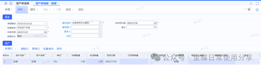 注:当资产做非财务变更不需要做新的折旧计提,当资产财务变更的情况下需要做折旧计提(计提方法看第四章 1.固定资产折旧计提) 变更后资产卡片可以查看变更记录 3.4固定资产领用及借用【业务场景】:企业用户对固定资产进行领用及借用 【用户角色】:管理会计 【功能菜单】:【资产管理】->【固定资产】->【日常管理】->【资产领用】 【操作说明】:这里的固定资产领用及借用指的是资产非财务性质的进行使用部门的变化,若涉及财务物权的转移则使用固定资产挪用。 领用:首先选择货主组织,再选择资产编码,若选不到资产编码,检查货主组织,填写领用数量及领用部门,并提交审核。 产品路径:资产管理-固定资产-日常管理-资产借用 借用:根据此资产是借入还是借出来选择单据类型,选择货主组织及借用组织,选择卡片编码及数量,实物信息位置有改变的进行更改,没有改变的不维护。 因为系统支持一卡多物,实物信息会带出这张卡片上的所有实物,所以如果只借用一张卡片中的一个,请维护你借用的那一个。维护完数据提交审核。 3.5固定资产挪用【业务场景】:固定资产组变更 【用户角色】:管理会计 【功能菜单】:【资产管理】->【固定资产】->【日常管理】->【资产调出】/【资产调入】 【操作说明】:选择调出资产组织及货主组织,调入资产组织及货主组织,填写需要调出的卡片编码,并提交审核 资产调出单审核后,调入货主组织会自动生成一张创建状态的资产调入单 如果在资产调入列表中没有看到单据,查看所在组织是否是调入货主组织,选择单据提交审核。 调入方调入后,系统会在资产调出单中勾选调入确认,以确认调入 如果资产调出后需要处理,通过资产调出单下推资产处置单。