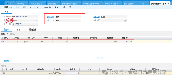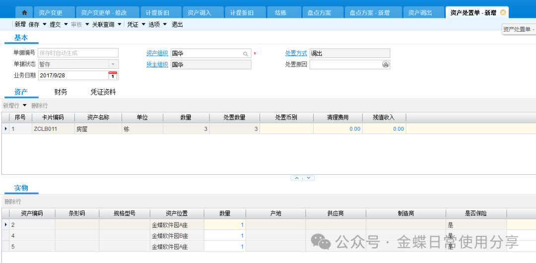 若资产卡片存在一卡多物(同一种物料多数量)的状况,则在实物信息页签中,可以通过资产编码区分不同的实物资产,一般一个资产编码一个实物资产,每个资产编码对应资产位置及数量。 注意:当一张卡片一卡多物的时候,在进行调入等日常管理时,该卡片上的所有东西都要进行该操作,变更频繁的固定资产,不宜一卡多物。 若资产卡片存在一物多分配的情况,则在使用分配页签中,针对资产编码设定分配比例。一个资产编码分配比例加一起应该为100%。 若还有附属设备、发票内容、维修保养需要记录,都可以放在附属设备、发票、维护保养页签中,此处仅作为管理需求存在,不影响财务计算。 3.2固定资产处置【业务场景】:企业用户对资产进行处置 【用户角色】:管理会计 【功能菜单】:【资产管理】->【固定资产】->【日常管理】->【资产处置单】 【操作说明】:当用户需要对固定资产进行出售等处置处理时,新增资产处置单,选择资产组织及货主组织,选择卡片编码,填入所需费用及得到的收入,确定实物分录,并进行提交、审核操作。 注:在做本月资产处置单之前不要做本月的计提折旧。