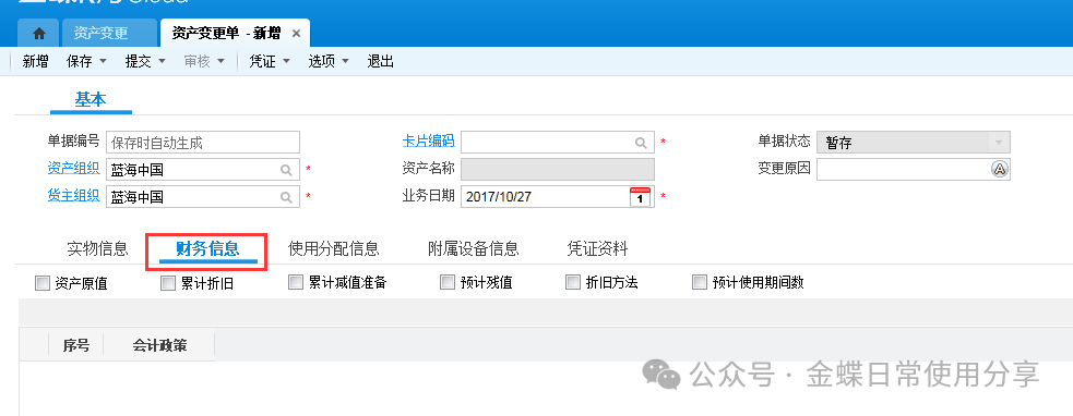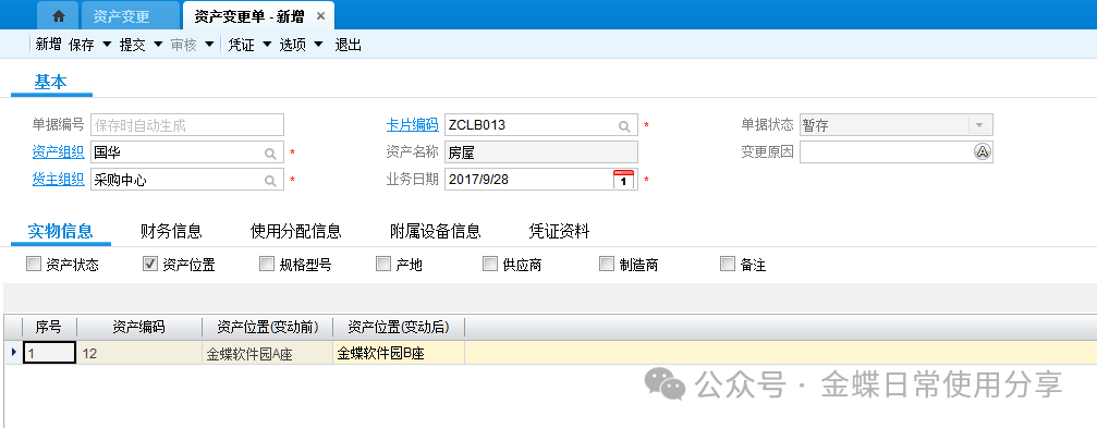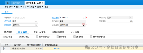 3.3固定资产变更【业务场景】:企业用户对存在信息变化的固定资产进行变更操作 【用户角色】:管理会计 【功能菜单】:【资产管理】->【固定资产】->【日常管理】->【资产变更单】 【操作说明】:新建资产变更单,首先选择资产组织及货主组织,选择卡片编码(只显示该资产组织及货主组织下的卡片编码,若没有需要的卡片编码,确定组织的正确性)根据实际情况填写变更数据,可变更的内容可详见各页签下信息,并提交审核。