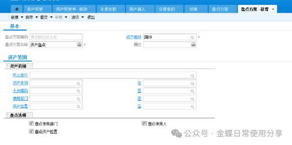 注:当一张卡片包含多个物料时,在调出时这张卡片上的所有物料都会调出,如果只要部分调出,需要对该张卡片进行拆单。 3.6固定资产盘点【业务场景】:企业用户对固定资产进行盘点 【用户角色】:管理会计 【功能菜单】:【资产管理】->【固定资产】->【资产盘点】->【盘点方案】 【操作说明】:选择资产组织、填写名称、设置本次盘点范围及盘点选项,并提交审核。盘点整个资产组织的资产,则不设置盘点范围,只盘点个别范围内的资产,则选择盘点范围。 提交审核后,回到盘点方案列表,选中盘点方案并点击生成盘点表 系统生成盘点表 选中需要盘点的盘点表,在选项中,点击套打,选中连续套打所选单据进行套打 实际盘点完之后,填写资产盘点表,选中本次盘点的盘点表,填写盘点数据,并提交审核。 根据盘点的结果,如果盘点数量与系统数量有差异系统会自动生成盘盈盘亏单 选中没有审核的盘盈盘亏单,提交审核。 3.7固定资产折旧计提3.7.1固定资产固定折旧 【业务场景】:企业用户对固定资产进行固定折旧 【用户角色】:管理会计 【功能菜单】:【普通用户】->【资产管理】->【固定资产】->【折旧管理】->【计提折旧】 【操作说明】:根据设定的折旧政策,若政策中新增资产卡片当月不计入计提折旧,计提折旧的当前会计年期即为启用年期,计提的只有初始资产。 若组织使用的折旧政策中设定新增资产卡片当月要计入计提折旧,计提折旧的当前会计年期即为启用年期,计提的是本月所有新增资产 折旧之后,系统自动生成折旧调整单,审核折旧调整单并生成凭证。 3.7.2固定资产变动折旧 【业务场景】:企业用户对固定资产进行变动折旧 【用户角色】:管理会计 【操作说明】: 1. 新增资产卡片时,勾选折旧方法字段下参数“按变动进行折旧”,则会按照该折旧方法下动态折旧公式进行折旧; 2. 若新增卡片时未勾选以上参数,后续做资产变更,变更了财务页签下信息时,会自动勾选该参数,然后按照该折旧方法下动态折旧公式进行折旧; 3.如果资产变更了财务页签下信息,还是想按照静态折旧公式进行折旧,可以勾选折旧政策中的参数“折旧要素变动时按静态折旧方法计算”;