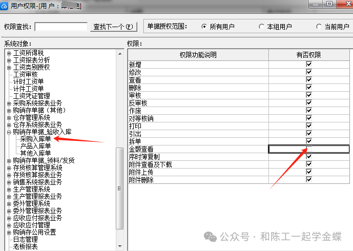 其实这只是你以为的取消而已,其实我们需要在上面的购销存单据-验收入库里面也要取消,你只取消它下面的,不取消它自己,那是没用的,应该在这里也要取消,这个问题是特别多客户问到的,就算把下面的采购入库产品入库其它入库全部取消,只要上面的购销存单据-验收入库没取消,他还是会拥有所有的权限。 ![]() ![]()