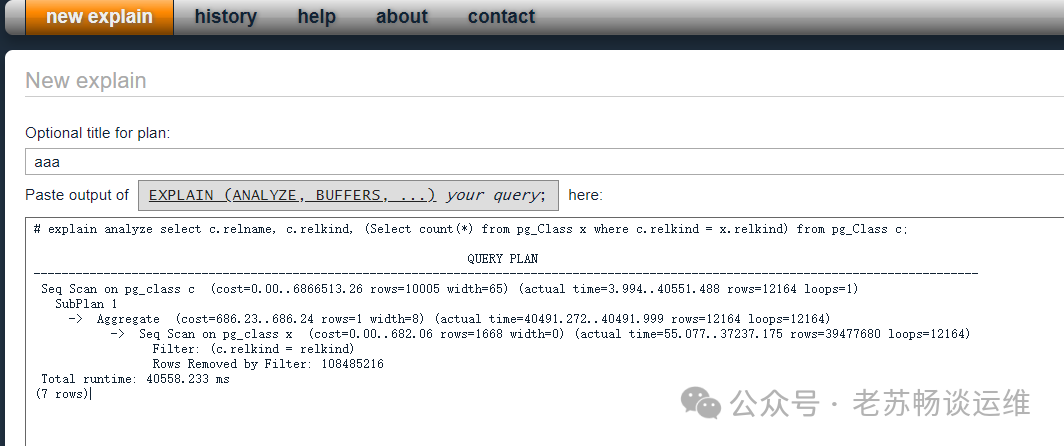 前言使用过Oracle的SQL Monitor的朋友都知道,它能够将复杂的SQL执行计划解析为直观的HTML可视化报告。清晰展示查询的执行路径、耗时分布及资源消耗,帮助开发者快速定位性能瓶颈,如表扫描、索引缺失、JOIN效率等问题。对于诊断慢SQL,该工具提供分析支持,大幅提升数据库调优效率。那对于PostgreSQL数据库,有没有类似的工具可以用来分析呢?答案是肯定的,那就是Depesz EXPLAIN ANALYZE visualizer,我们看一下它的使用方法。 在线访问方式可以直接访问:https://explain.depesz.com/ ![]() 本地搭建方式当然除了在线访问,你可以本地部署,以下是本地部署步骤。 安装Docker环境(此处略过Docker安装步骤) 克隆项目源码git clone https://gitlab.com/depesz/explain.depesz.com.git 拉起镜像进入项目docker目录并启动容器: cd docker/ 若出现镜像拉取超时: # docker-compose up --build 解决方案:更换Docker镜像源 编辑配置文件: cat /etc/docker/daemon.json 内容如下: { 重启Docker服务: systemctl daemon-reload && systemctl restart docker 验证部署查看运行中的容器: docker ps 正常输出示例: CONTAINER ID IMAGE PORTS NAMES 若服务卡住,可尝试: docker-compose start 访问服务成功启动后访问: http://[你的服务器IP]:3000 ![]() 使用方法使用方法简单:第一个标题随便输入,第二个空栏贴上您的执行计划,接着点提交,即可基于当前的执行计划生成一份HTML的报告。 ![]() ![]() 用红色背景高亮显示,是我们的重点观察对象。 最后的stats列是SQL的总览信息 转自:https://mp.weixin.qq.com/s/sS8ucKBpzmgt_T85mZW_fQ 该文章在 2025/8/19 10:26:39 编辑过 |