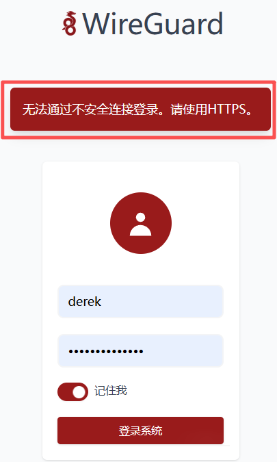6️⃣默认wg-easy必须使用https登录,可以配置环境变量- INSECURE=true来使用非安全的连接,配置后重启生效。
