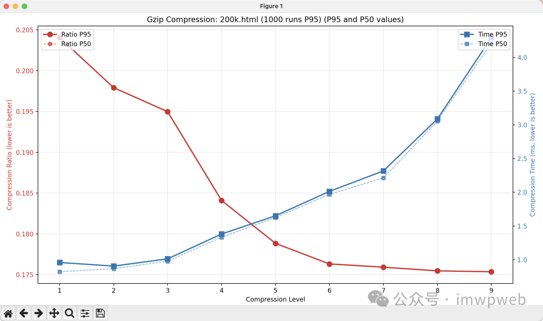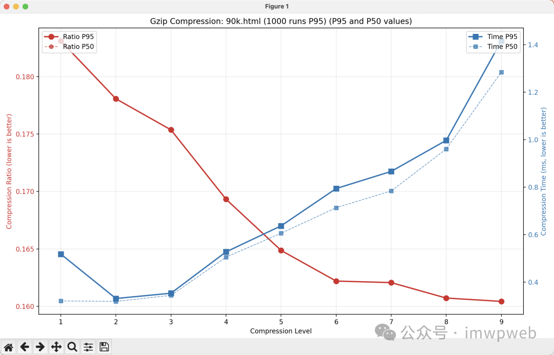看起来和 50k 的网页曲线很相似。其原因是 50k 的网页是我从 90k 的网页截取一部分得来的。在压缩比为 6 之后,压缩率下降不明显,然而执行耗时上涨迅速。这个数据也是在 6 以后压缩率就不明显了。压缩耗时一直上涨。同样还是在 6 以上压缩率就下不去了,而压缩时间一直随着压缩级别上升而上涨。
