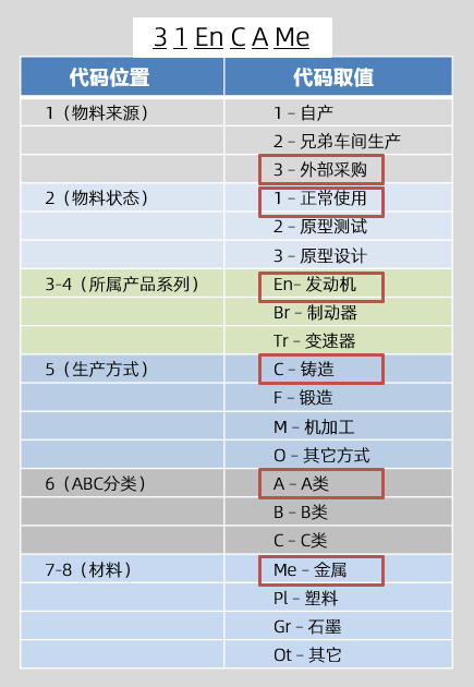因为篇幅有限,我会捡一些重点来聊聊。 *** 对于物料编码问题,主要有四类,就是一物多码、一码多物、有物无码和有码无物。只要存在这四类问题的任何一类,给企业带来的主要危害,要么是库存积压,要么是生产缺料,还有就是会浪费大家的时间。 常用的物料编码方法,主要有三种,就是有意义编码法、半意义编码法和无意义编码法。 所谓有意义编码法,就是编码里面的每一位数字或者字母,都是有意义的,比如可以用这些数字或者字母,来代表物料的长度、宽度、高度、直径、重量、体积、材质、颜色、生产方式、图号、供应商等等。 请看上图,这里有一个物料编码31EnCAMe,结合图中的物料编码规则,我们可以了解这是一个什么物料。这是一个从外部采购回来的物料,这个物料目前是正常使用,属于发动机系列的配件,是一个铸造件,属于A类物料,它的材质是金属。可以看出,编码中的每一位都是有意义的。 如果是半意义编码法,就是分类码加流水号的形式,前面的分类码是有意义的,后面的流水号是无意义的。我们常用的身份证号、银行卡号、手机号,都是采用这种编码方法。 所谓无意义编码法,就是整个编码只是一个流水号,编码里面的每一位数字或者字母,都没有任何意义,单纯只是一个编码。 *** 在处理物料编码的时候,我们一定要认识到,有意义编码法,是手工管理环境下的产物。因为在手工环境下,物料编码只是一个编码。在手工环境下,如果我给你一个物料编码,你很难去找到一份档案来告诉你,这个编码代表的是一个什么样的物料。这时候通过采用有意义编码法,并且结合物料编码规则,相对来说,是一个比较好的做法。至少通过编码,可以让我们大致了解,这是一个什么样的物料。就像我们刚才看的这个物料编码,如果这个编码只是一个没有意义的流水号,我们就不能通过编码获得任何信息。 在以前的年代,企业的产品比较单一,产品结构比较稳定,并且产品寿命也比较长,有意义编码法确实有其用武之地。但是现在,随着企业的规模越来越大,物料的种类越来越多,产品的生命周期越来越短,有意义编码法的问题,就会越来越明显。会存在哪些问题呢?只要会存在两个大问题。 第一个问题,会导致编码太长。随着物料的种类越来越多,意味着有更多的属性要添加到编码里面,所以编码会越来越长。 第二个问题,缺乏灵活性。因为同一个物料,它的属性经常会变化。比如我们刚才说的这个物料,现在是A类物料,如果将来变成了B类物料,该怎样处理呢?为了让编码里面的意义正确,我们可以给它换一个编码。换一个编码会带来什么问题呢?就是容易导致一物多码。因为这个物料本身的属性,并没有发生变化,还是同一个物料,现在却有了两个编码。如果在企业里面,有的人用以前的编码,有的人用新的编码,就导致了一物多码。 如果不换编码,还是用以前的编码,就会导致编码里面的意义是错误的。比如刚才说的物料已经是一个B类物料,但是编码里面还是A类物料。如果编码里面的意义是错误的,就容易引起误导,出现管理混乱。 可见如果采用有意义编码法,只要企业的产品种类越来越多,物料越来越多,就会引发各种各样的问题。或者说,如果企业现在还是采用有意义编码法,就等于是进入了一片沼泽地,只会越陷越深。 要想脱困,最佳时机就是ERP实施。企业一定要通过ERP实施,通过采用无意义或者半意义编码法,来解决物料编码问题。 *** 为什么在ERP环境下,企业一定要采用无意义或者半意义编码法呢? 因为在ERP环境下有一个很大的优势,就是可以给每种物料维护一份物料主文件。 上图是一份简化版的物料主文件。当有了这样一份物料主文件,我们还会根据物料编码,然后再对照物料编码规则,去了解这是一个什么物料吗?应该没有人会这样做。可见在ERP环境下,我们不会通过物料编码来识别或者了解物料,而是通过物料说明或者物料主文件里面的其它字段,来识别了解物料。 总的来说,在手工环境下,因为没有物料主文件,只能把物料的分类以及具体属性,尽可能地放在物料编码里面,用来帮我们识别一个物料。现在通过ERP系统,有了物料主文件,这些管理分类以及具体属性,完全可以脱离物料编码,放到物料说明里面,或者放到其它字段里面。这就为企业采用无意义编码或者半意义编码法,提供了强有力的支持,我们再也不用在物料编码规则上面费时费力。 更重要的是,通过采用无意义或者半意义编码法,刚才提到的有意义编码法的两个大问题,就不存在了。比如可以大幅缩短物料编码的长度,因为不用把物料的诸多分类以及属性放进编码里面,当然可以缩短长度。 举例来说,如果采用纯数字的流水号,8位编码最多可以代表一亿种物料。如果编码中用字母,代表的物料会更多,因为数字只能从0到9,而字母有26个。你想想看,什么样的超级企业能用这么多的编码呢?也就是说,如果企业的物料编码超过了7位或者8位,就应该想想,编码位数是否合理。 编码短有什么好处呢?第一个好处,可以加快输入速度,可以减少输入错误。第二个好处,可以提高沟通效率。在平时如果要通过物料编码来沟通交流,可以少写几个字符。 另外就是,通过采用无意义或者半意义编码法,在处理物料编码相关问题时会更加灵活。比如一种物料以前是A类物料,现在变成了B类物料,只需在物料主文件里面修改一下相应字段,