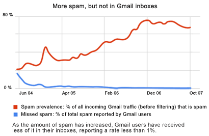 主要原则有四条: 1、用户帮助 Gmail有自己的反垃圾邮件算法,但算法总不能100%保证垃圾邮件被拦截,偶尔还是会有垃圾邮件塞进了用户的收件箱,这时候就需要用户配合。当收件箱收到垃圾邮件时,用户点击“Report spam”就非常重要;同样,当Gmail不小心将正常邮件放到垃圾邮件箱时,用户点一下“Not spam”也很重要。依靠用户的帮助,当以后再收到类似邮件的时候,Gmail将更加智能地判断垃圾邮件和正常邮件。用户对这两个功能用得越多(而非简单地删除或捞回到收件箱),系统越智能。 2、快速适应 Google搜索的计算能力也能对判断垃圾邮件起到帮助作用。网络上一旦有新的垃圾数据出现,Google搜索的计算网络可以帮助Gmail系统自动适应新的垃圾数据的模式,从而过滤类似数据的邮件,提高垃圾邮件识别率。 3、基于Google全体力量 Google内部有很多产品团队,每个团队或多或少都会为反垃圾做出贡献。比如,Google图书搜索(Google Book Search)项目的核心技术是视觉特征识别(OCR, optical character recognition)技术,相信大家都收到过那些将文字做在图片上的垃圾邮件吧?利用OCR可以加强Gmail对图片垃圾邮件进行识别,从而过滤掉类似的垃圾邮件。 4、强大的验证系统 许多网络邮件服务都有验证系统来判断发件人是否可疑。Gmail支持多个验证系统,包括SPF (Sender Policy Framework), DomainKeys, and DKIM (DomainKeys Identified Mail),所以Gmail可以判断你的邮件究竟来自哪里,防止某些伪装成合法邮件的垃圾邮件被发到收件箱。 最后再附张图: ![]() 该文章在 2012/6/14 23:25:39 编辑过