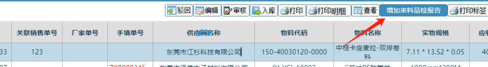 然后点中一条要做来料报告的物料信息,再点击新增来料报告按钮