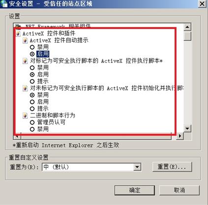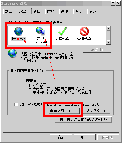 然后对前面的两项“Internet”和“本地Intranet”都要点击“自定义级别…”,重复执行以上的设置,确保“Internet”、“本地Intranet”、“可信站点”三项的配置都开放了以上参数: