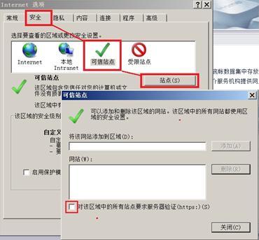 操作:依次选择【安全】---【可信站点】--【站点】。确保“对该区域中所有xxxxx”中的钩选项为空。