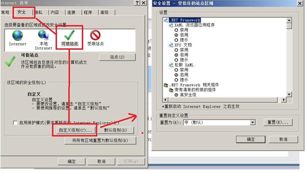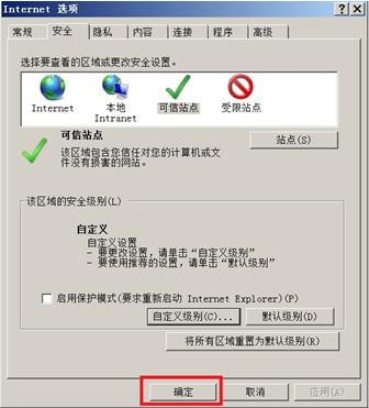 操作:重复(2)进入INTERNET选项。依次选择【安全】【可信站点】【自定义级别】