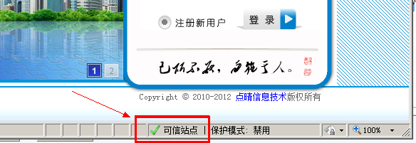 注意:如发现列表中已经包含该网站地址,可以使用删除后重新添加的方式。该列表中出现站点,将对其采取不同设置方式,请确保列表中站点地址是否为合法安全网站。完成这个步骤后,页面右下角,将变成“可信站点”字样,如下图。