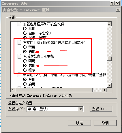 注意:“将文件上载到服务器时包含本地目录路径”、“通过域访问数据资源”和“跨域浏览子框架”项,应确认为“启用”状态,该选项可能会因为某种原因变更回默认的“禁用”。