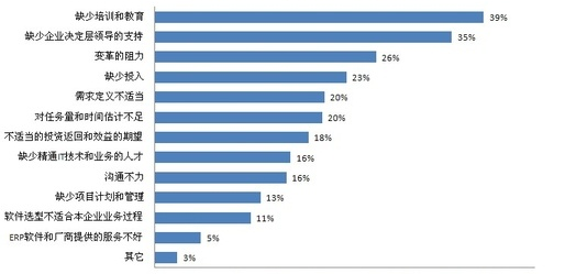 调查显示,企业在实施ERP系统时遇到的最主要两个问题是:缺少培训和教育(39%)、缺少企业决定层领导的支持(35%),这些问题存在比例均超过30%。另外,变革的阻力、缺少投入、需求定义不适当和对任务量和时间估计不足问题存在比例分别为26%、23%、20%和20%;其他问题存在比例均低于20%,包括:不适当的投资返回和效益的期望(18%)、缺少精通IT技术和业务的人才(16%)、沟通不力(16%)、缺少项目计划和管理(13%)、软件选型不适合本企业业务过程(11%)、ERP软件和厂商提供的服务不好(5%)等。 通过上述数据可以看出,企业在实施ERP系统时所存在的问题主要是企业自身的问题。与去年的调查数据相比,今年缺少培训和教育超过了需求定义不适当成为了企业实施ERP系统所存在的主要问题。可以看出,去年企业存在的问题还主要在布置阶段,而现在企业在信息化建设上已经初具规模,且有了一定的成功经验,但却缺少了对员工的培训和教育,使ERP系统成了鸡肋。一个企业要想成功实施ERP系统,并能让其真正产生效益,不仅需要从需求分析、项目实施环节下手,更要对变革阻力、内部沟通、领导支持、人才储备、人员培训等困难有充分的准备。 该文章在 2013/1/4 23:37:17 编辑过 |