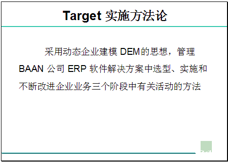人员/系统/组织(PSO)项目 § Target实施方法论指出企业内部三个核心方面:人员、系统和组织(PSO)。 § 在Target实施方法论中引入人员/系统/组织(PSO)的专门活动以确保其完整性。 企业业务改进 v Target实施方法论 企业方案(TEP)包括同时进行的业务改进和系统实施以及切换到新系统。 v 传统方法: · 业务改进与系统实施过程分离 · 实施前要定义目标模型 · 目标模型与系统功能不完全匹配=>客户化,修改 v Target企业方法: · 同时进行的业务改进/系统实施过程 · 集中ERP软件机遇/世界级实践的优点 · 动态企业模型的使用 · 专注于不断改进企业业务 分析、试运行和切换 前一阶段结束再开始下一阶段。在整个项目中各项活动要仔细地定义,责任明确且结果要可以预见。 五、和佳项目实施方法 在企业购买《和佳ERP》产品后,并不能说明该企业已经成为一家ERP企业。因为和佳ERP系统不仅仅是一个软件系统,更主要的是它蕴含了现代化的管理思想。而实施《和佳ERP》系统的过程正是将这套思想在企业推行、发展的过程。 《和佳ERP》这套实施方法是和佳公司通过实施国内近80个企业后总结积累出来的。通过实践,它被用户证明是一种能使用户在短时间内快速和成功实施《和佳ERP》的有效方法。它是专门设计用于实施《和佳ERP》的一种全新的方法。它简单,易行,用户只要按照实施指南中的步骤进行每一步操作,就会将保证项目在本企业实施的成功。 本项目实施方法用了在项目开发和管理中极为重要的四个关键工具和技术: 1、项目组织 项目组织定义了为实施系统所需的人员策略和组织结构,项目组织的定义将涉及到贵公司的各个部门 2、项目进程 项目进程定义了为成功实施系统所需的阶段、步骤、活动和任务。每一阶段、步骤、活动和任务都有明确的目标和应完成或应得到的结果,所有的这些都是为了最终目标-成功、高效、全新的管理信息系统服务 3、项目指导 项目指导为项目实施人员提供应用结构化技术来指导项目的各个活动,这种技术有助于项目管理和软件开发的规范化及项目小组成员的交流 4、项目计划和控制 应用网络优化计划技术来: 调度和控制项目的各项活动和任务 分配所需资源 项目重新调度以解决过度工作负荷 制定项目预算 监视和佳/ERP实施项目的进程 解决各活动和任务间的时间冲突 保证在计划的时间和预算内完成项目的各进程 六、用友实施具体步骤 ①产品实施的前期工作——系统规划阶段 这个阶段非常重要,关系到产品实施的成败,但往往为实际操作所忽略。这个阶段的工作主要是:领导层、关键用户培训及信息管理系统业务流程、思想的培训,使企业的中上层领导干部掌握基本原理,理解信息管理系统,用信息管理系统的思想对企业现行管理的业务流程和存在问题进行评议和诊断,寻求解决方案,用书面形式明确预期目标,并规定评价实现目标的标准。要完成需求分析正式书面报告,做出正确决策。 在这一阶段通过调查,应能回答以下问题: 产品实施的难点在哪里,能否解决,如何解决? 实施的基本条件是否具备,还需要做哪些基础工作? 对实施工作量和进度如何估计? ②实施准备阶段,包括数据和各种参数的准备和设置 这个阶段包括以下几个部分: 制定产品实施进度计划、确定具体的实施方案。根据上个阶段的讨论、调研确定一个内容详细、顺序合理、责任明确、进度积极的实施计划和可行性方案。 明确的实施计划、确定了方案后,需要进行数据的准备。其中,有些静态数据可以在实施之前就着手准备和设置。 数据准备。在运行信息管理系统前,要准备和录入一系列基础数据,这些数据是在运用系统之前没有或未明确规定的,故需要做大量分析研究的工作。包括一些产品、工艺、库存等信息,还包括了一些参数的设置,如系统安装调试所需信息、财务信息,需求信息等等。 在这个过程中,作为信息管理系统实施方来说,主要的责任是协助企业确定主数据的分类、字段的选择、提供资料搜集格式等,而具体的搜集和整理工作是由客户方完成的,实施顾问应当对整理工作的组织和计划提供帮助和经验,减少企业的弯路,保证实施计划顺利进行。 系统安装调试。在人员、基础数据已经准备好的基础上,就可以将系统安装到企业中,并进行一系列的调试活动。 实施方案测试。这是对软件功能的原型测试,也称计算机模拟。由于信息管理系统是信息集成系统,所以在测试时,应当是全系统的测试,各个部门的人员都应该同时参与,这样才能理解各个数据、功能和流程之间相互的集成关系。找出不足的方面,及时调整实施方案,以便接下来进行用户化或二次开发。 确定二次开发内容。开始二次开发调研,确定需求内容,制定二次开发、测试计划。 ③模拟运行及用户化 在基本掌握软件功能的基础上,选择代表产品,将各种必要的数据录入系统,组织项目小组进行实战性模拟,对于实施方案中不合理处,提出解决方案,并及时进行调整。模拟可集中在机房进行。在完成必要的用户化的工作、进入现场运行之前要经过企业最高领导的审批和验收通过。 ④系统切换运行 根据企业的条件来决定应采取的步骤,可以各模块平行一次性实施,也可以先实施一两个模块。在这个阶段,所有最终用户必须在自己的工作岗位上使用终端或客户机操作,处于真正应用状态,