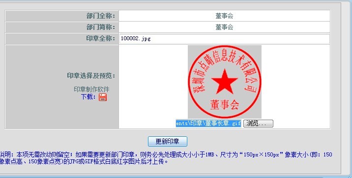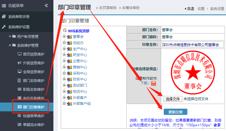 点晴客服: 印章管理位置:系统设置-》系统维护设置-》部门印章维护 ![]() 在以上位置,可以下载印章制作软件,自行制作所在部门或单位的印章,然后上传到对应部门,完成绑定。 工艺部曹*华(924853073) 16:51:01 这个印章怎么提交了还是你们原来的印章 无泪止缄(49022925) 17:02:07