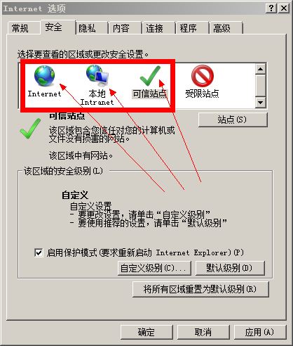 对没有标记为安全的ActiveX初始化和脚本运行“启用”(下载插件后在改为禁用) 下载未签名的ActiveX控件“启用”(下载插件后在改为禁用) 下载已签名的ActiveX控件“提示” 运行ActiveX控件和插件“启用” 然后点击“确定”保存。 然后对“本地Intranet”和“可信站点”两个项目的“自定义级别(C)...”也按照以上设置更改后保存。 更详细设置方法参见以下教程: