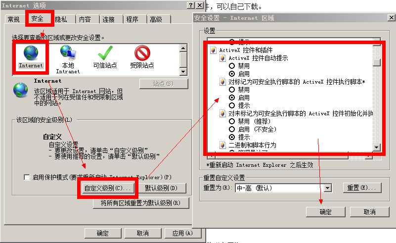 设置方法:打开IE浏览器-》工具-》Internet 选项,在弹出的窗口中选择:安全-》Internet-》自定义级别,然后在弹出的子窗口中选择项目:ActiveX 控件和插件,各个子项目都选择为启用或提示吧: