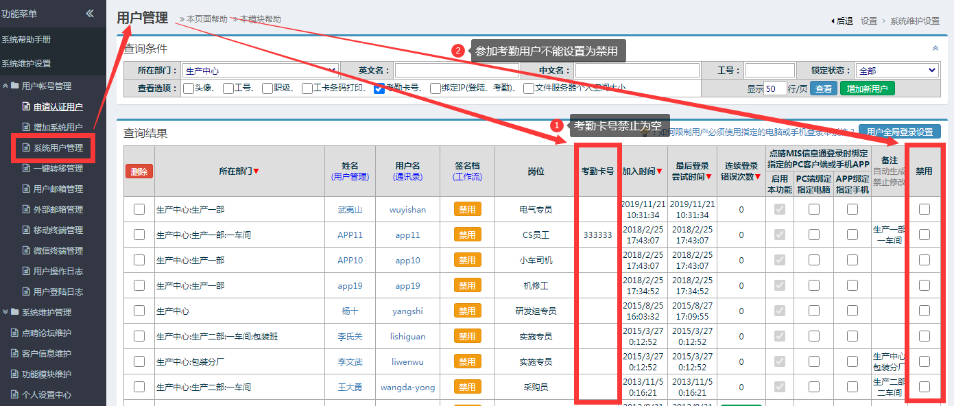 1、导入的考勤人员名单必须事先已经全部都已经在点晴OA中创建,员工的状态必须是启用状态,不能是禁用状态: