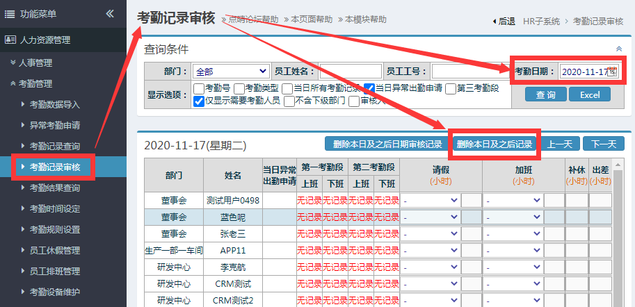 c.如果无法判断是否已经导入,或者导入数据异常,可以在考勤记录审核页面中,将“考勤日期”设置为本次待导入考勤记录的开始日期,然后点击“删除本日及之后记录”,就可以彻底清除本日之后考勤记录的干扰,然后重新导入考勤记录即可: