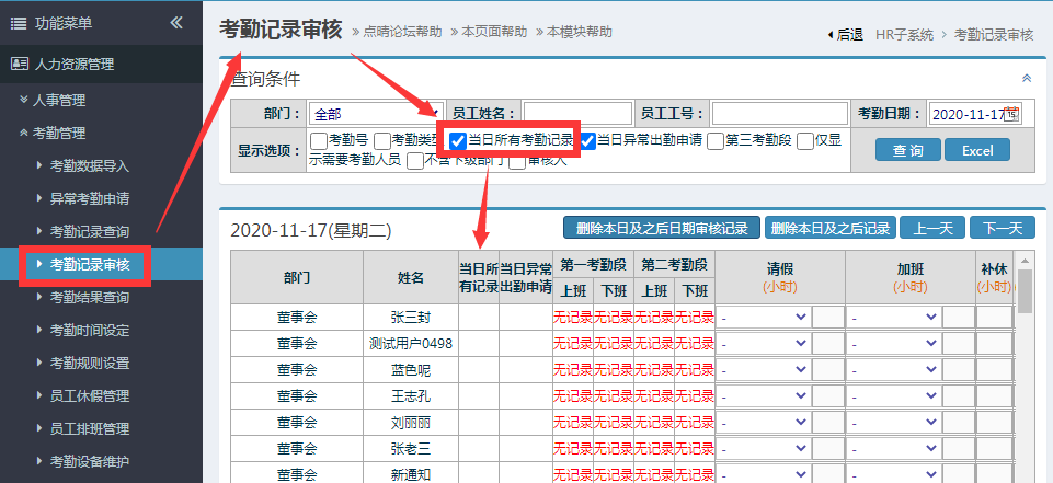 如果在考勤记录查询中,能查到刚刚导入的数据,但在以上考勤记录审核中没有看到员工的考勤记录,那么就是考勤时间不符合设定的正常考勤时间范围,勾选显示“当日所有考勤记录”,就可以看到所有人的考勤记录了。