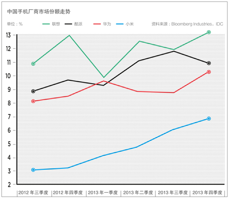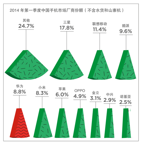 第一句话隐含着占有率为世界第三的华为手机正拥有一种“品牌确立”的自信,同过去的“白牌手机”历史一刀两断,品牌溢价产生正确的价格观。华为掌门人任正非曾在一次讲话中提醒,华为手机不要为了占有率的机会主义目标而丧失了利润导向。 第二句话意味着华为已经不认为和三星之间存在巨大的差距,三星所谓的“全产业链”优势即将摇摇欲坠。华为除了不做屏,其他的能力同三星相差无几,而屏幕现在已经不是什么独特的优势。余承东对《二十一世纪商业评论》(下称《21CBR》)记者说,“尽管苹果是第二名,但它有着独特的产业链,跟我们不是一个层面的竞争。但三星则不是。” 三星变成了一个古怪的存在,它的确是老大,但谁又都不服气这个老大。 Strategy Analytics公司的尼尔·莫斯顿则忧虑地表述即将到来的局面:苹果推出iPhone 6,破天荒采取大屏策略,从高端机层面打击了三星;而错开价位的中国厂商华为们则从另外一端对三星形成巨大压迫。 他的结论:三星电子股价看上去非常不妙。 5月7日发布的Ascend P7是华为新一代的旗舰机型,它是华为去年旗舰机P6的升级版。P6被认为是华为“里程碑”的作品,一部“跳出米缸、迎来自我”的手机。 在华为内部,余承东一直强调华为手机品牌的重要性,他说:“你会发现一个有意思的现象,就全球而言,华为在哪个国家早点实施品牌战略,现在这个国家就成为华为手机的大卖地,比如欧洲的西班牙、南美的委内瑞拉。”反之亦然,比如法国。 华为消费者BG营销副总裁邵洋告诉《21CBR》记者,P6第一次打整体体验概念,而不是单一的性能。 华为P6的广告词是“雅然之美”,这种非具象型的品牌策略起初让人一头雾水,引来很多吐槽,但最终效果超预期,“尽管此前很多人说女人持剑的形象让人看不懂,但实际效果却非常好”。P7也延续这套非具象策略,广告语是“君子若兰”,有点“中国风”感觉,改变了P6的卷轴设计,呈现出较多的男性因素。此外,P7的价格策略也和P6一样,海外定价依然比国内高1000元人民币左右。 华为P6手机 余承东先向记者解答了P6销售目标未达预期的疑问:“P6的销售目标原本是1000万,去年7月份开卖,目前卖出了400万,看上去没有达标,这是有原因的,主要是因为4G突然上马,4G来了,大家都要跟着转,而P6不是4G手机,所以产能被调整了。其实,P6只卖了5个月。实际上,P6卖得非常好,海外现在还在卖,由于库存不足,处于缺货状态。” P1、P6和P7分别是华为不同阶段的代表:试探品牌化路线的P1卖出40万台、里程碑的P6目前是400万台,而新发布的P7销售目标依然是1000万台。 如果P7成功,这将是一条快速的数字进化曲线。 余承东说:“P7的销售目标还是1000万,我有信心,至少它比P6的销售期要长。”他告诉《21CBR》记者,“华为今年的智能手机整体出货量至少是8000万部,甚至会达到1亿部”。邵洋表示,P7目前的售卖环境比P6要好,“比如P6刚上市的时候才8个国家开卖,P7则是33个国家,短短两个月后即可再拓展到数十个国家。” 如果华为出货量能达到8000万部,那么在全世界的份额将从目前的4.9%跃升至8%,不一定能坐第二,但至少与第四名拉开了差距。 华为方面估计,P7大约会有一半卖给海外市场。华为在海外市场拥有优势,强于国内竞争者如联想或小米。中国市场的饱和程度要高于外部市场,中国智能手机市场的放缓速度出人意料。联想小米开始大肆在海外扩张。联想手机也渴望像联想电脑一样赚取海外市场占有率,为此它甚至挖来了诺基亚的赵科林。赵曾经在华为短暂停留。而小米挖来谷歌员工雨果.巴拉开拓国际市场,希望用物美价廉的“互联网思维”征服新加坡等国家,不过,目前成效甚微,小米手机97%的销售量还是发生在中国内地。 2012年——2013年中国手机厂商市场份额走势 原因很简单,海外的手机市场并不是一个由社会化渠道主导的市场,这不是小米擅长的领域。电信运营商是手机厂商最重要的渠道,手机价格的制定就不是成本加利润那么简单,而是资费包的设计、选择和博弈。相似价位的手机,如果电信运营商给予不同的资费档,对手机消费者给予完全不同的补贴政策,那么最终售卖的结果会天壤之别。华为的优势是一直给全球电信运营商提供设备,也为它们生产过白牌手机,从某种意义上,华为手机可以借助运营商业务的关系优势和渠道优势。 邵洋说:“我们观察到,海外运营商有一种降低手机补贴的趋势,这对华为是有利的。”这是什么意思呢?三星手机定价非常高,但运营商愿意给予galaxy S系列更多的补贴,使得消费者获取的资费档比价格便宜的华为更优惠,那么,消费者还是会入手价格更高的三星手机。一旦运营商改变了资费档的补贴策略,局势将发生有趣的逆转。 “海外市场有放大作用,”一位分析人士告诉《21CBR》记者,“中国手机市场很不妙,今年一季度来看,整体出货量环比不断走低,前所未见。今年很多中国厂商的命运将非常惨烈,它们完全是价格思维,利用电商渠道走量,并不考虑利润和长期研发投入,它们今年赚不到钱。”他以工信部公布的数字为证,一季度手机出货量为1亿部,同比狂跌24.7%。仅从智能手机来看,一季度出货8911万部,也下滑了9.8%。这是手机出货量在连续七个季度的增长之后首次下降。 相比较而言,海外市场的增长空间远远大于国内,“如果考虑到人民币最近正在贬值,如果华为海外销售强劲的