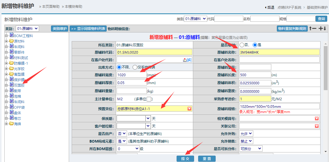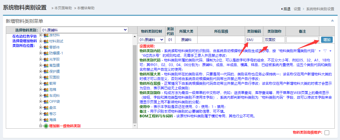 注意事项与说明:类别编码(SMJ)自定义设置,最终原材料的名称效果为:01.SMJ.1000001 。 2.增加原材料信息 步骤 系统管理——物料管理——新增物料,如图所示: 必填资料有:物料名称、预置货位、物料长度、物料宽度、预置货位。