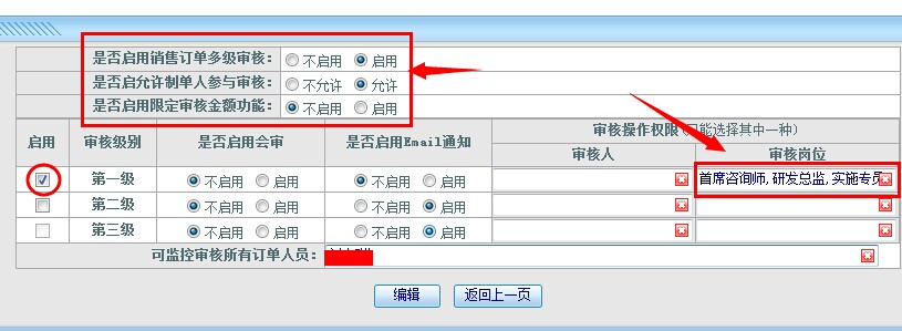 填好要求资料即可 疑问二 启用上述功能并添加审核岗位还是有些单据不能审核。 原因:那些不能审核的单据为开启功能之前下的单据;新增的审核人员只对之后录入的订单有审核权限; 另:管理员需给对应人员开启审核权限。如图: