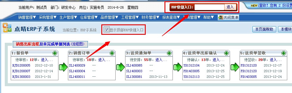 仓库生产入库除了从操作菜单进行入库操作,还有一种快捷方式,首先开启ERP快捷入口,如下图示: