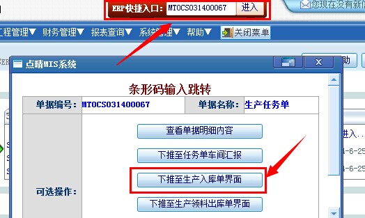 在ERP快捷入口输入框手工填写对应的生产工单,(或者用扫码枪扫描生产工单的条码)点进入,如下图所示: