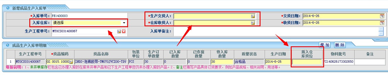 此页面自动生成对应生产工单的产品编号,数量,只需填写相应货位以及交接人即可。