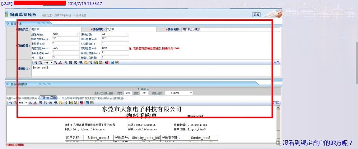 如上图所示,为什么打印模板没有绑定客户的选项框呢? 解答说明:这个是默认模板,默认模板是不需要绑定客户的;如要绑定客户,需要新增模板。如下图: 点晴模切ERP更多信息:http://moqie.clicksun.cn,联系电话:4001861886 该文章在 2014/7/19 14:40:48 编辑过 |